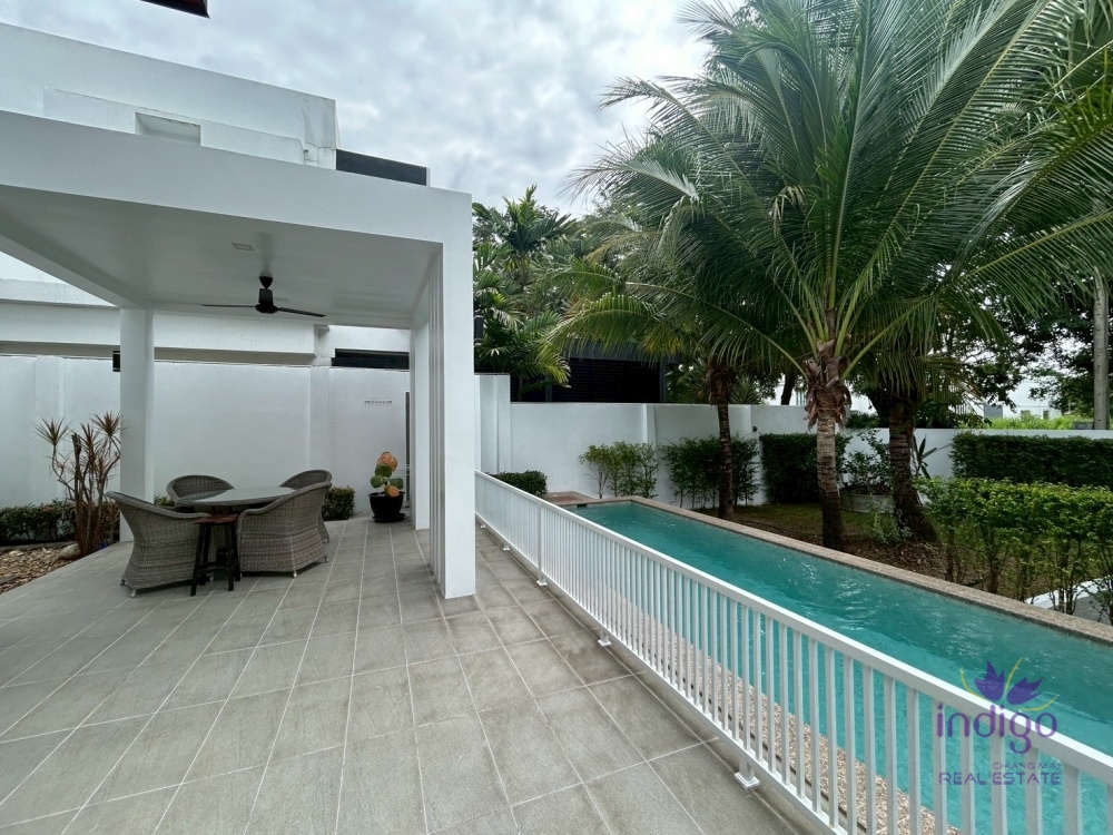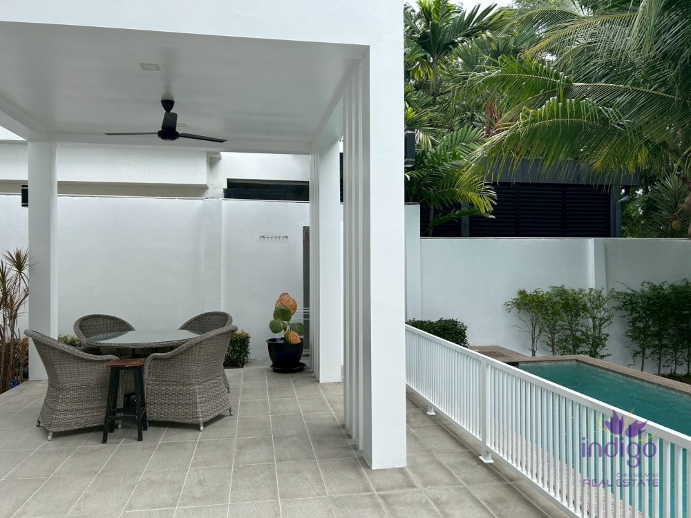 •สระว่ายน้ำระบบเกลือส่วนตัว พร้อมชานพักและพื้นที่รับประทานอาหารกลางแจ้งแบบมีหลังคา