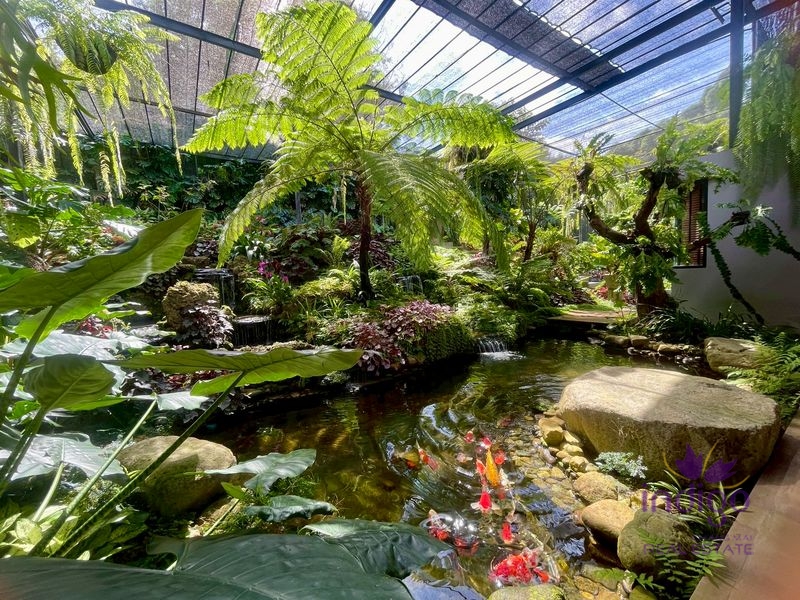 - Rear balcony connected to a large pond and garden with a waterfall